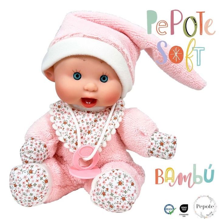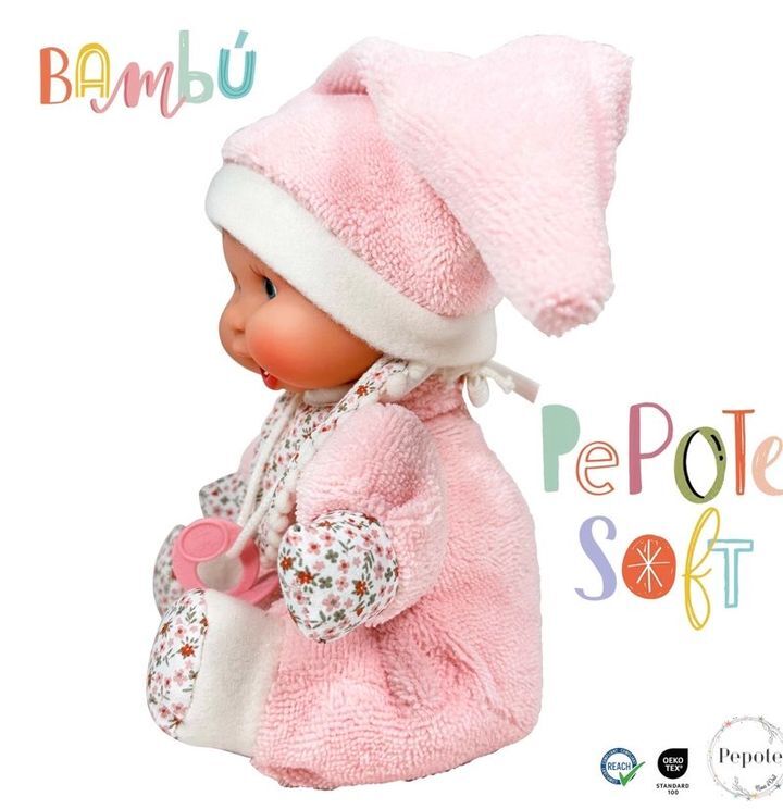 Our Pepotes Soft Bambú dolls are the cuddliest in our collection, dressed in cozy, pastel outfits made from eco-friendly fabric. These adorable Pepotes come in a variety of soft colors and textures, perfect for snuggling and playtime. Their charming pajamas and matching hats give them a sweet and comforting look, making them the perfect bedtime companions. Like all Pepotes, they are collectible and chosen at random, ensuring each one is a delightful surprise. * Made in Spain. * Product language: Spanish. * Vinyl body.