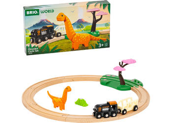 Roar! There's a dinosaur on the track in the 36098 Dinosaur Circle Set. This 12-piece dinosaur-themed train set includes a train with wagon, dinosaur figure, grassy meadow crossing and wooden tracks to complete the circle layout. Be careful as the train approaches the crossing as this colourful dinosaur loves to eat the leaves from the tree. Use its tail to raise and lower the dinosaurs head, then grab accessories with the classic BRIO magnet.