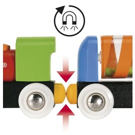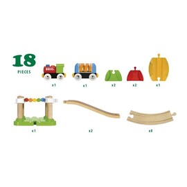 BRIO My First Railway Beginner Pack 18 pcs is a brightly coloured wooden train set for the littlest train drivers to begin their Brio train journey! Inquisitive toddlers, will enjoy setting up their track and driving the train with it’s wagon over and under the rainbow suspension bridge. Designed for toddlers from 18+ months, this sustainably harvested wooden train set, is made with the Brio philosophy in mind - Never stop playing!