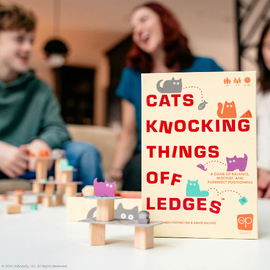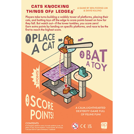 In Cats Knocking Things Off Ledges, players take turns building a wobbly tower of platforms, placing their cats, and batting toys off the edge to score points based on how far they fall. But watch out - if the tower tumbles, you score zero! Earn extra points by landing on specific platforms, and race to be the first to reach the highest score.ily, even perfect strangers, shouting and laughing out loud as they try to beat each other to the punch!