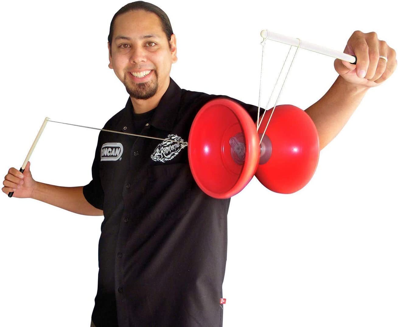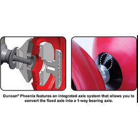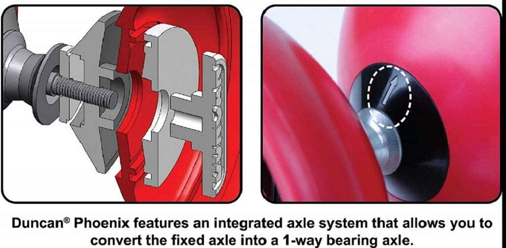 No longer will diabolo players have to choose between a fixed axle and bearing diabolo! Duncan now offers both in a single diabolo with the Phoenix! By hand tightening the knobs the player can quickly switch axles back and forth for variations in play and to accommodate any skill level. Featuring high speed roller bearing technology for low string friction and long spin times, Phoenix is the only diabolo for both beginner and pro players alike!