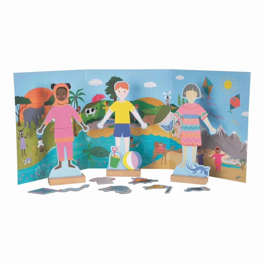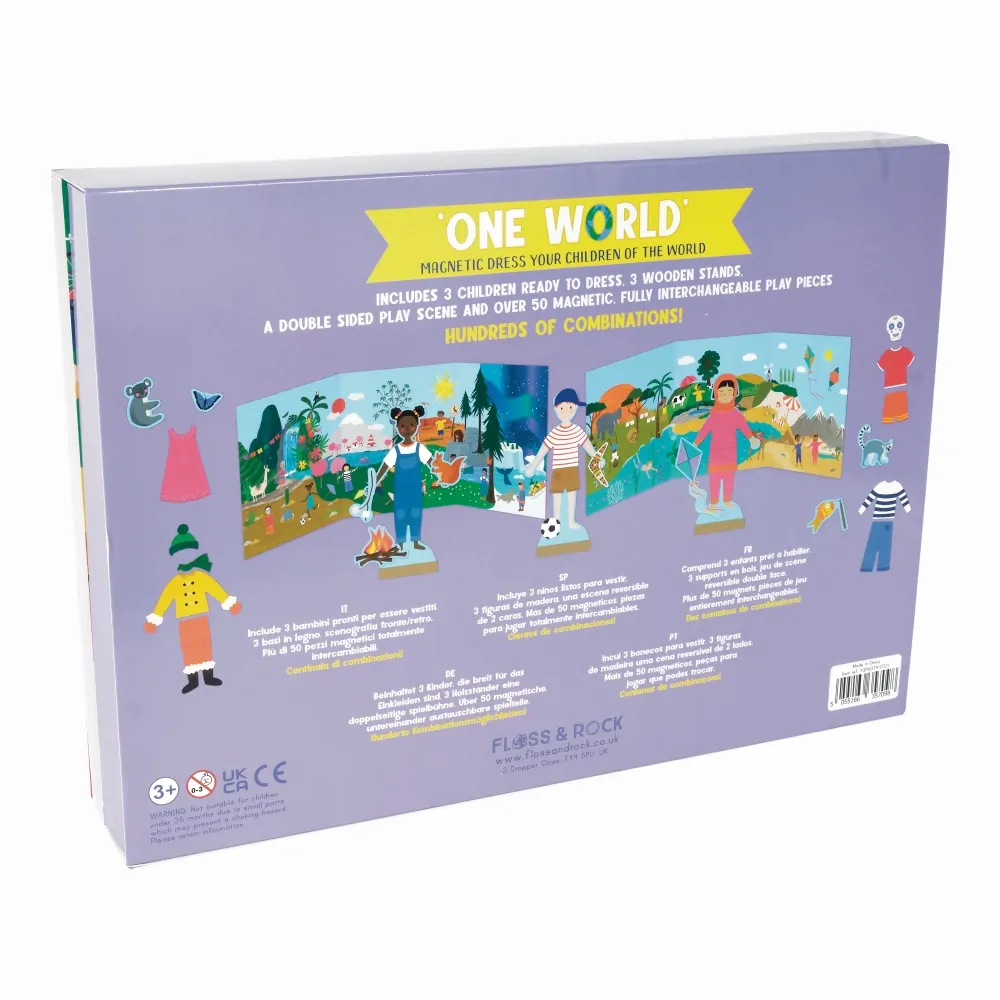 Floss & Rock Magnetic Dress Up – Children of the World: Discover Cultures Through Play! Product Description: The Floss & Rock Magnetic Dress Up – Children of the World set is an engaging and educational toy that introduces children to global diversity through imaginative play. Key Features: Diverse Magnetic Characters: Includes 3 characters with individual wooden stands, representing cultures from around the world. Over 50 Magnetic Pieces: Offers a variety of costumes, animals, and props for endless dress-up fun and cultural exploration. Reversible Playscene: Provides a dynamic backdrop for creative storytelling and adventures.