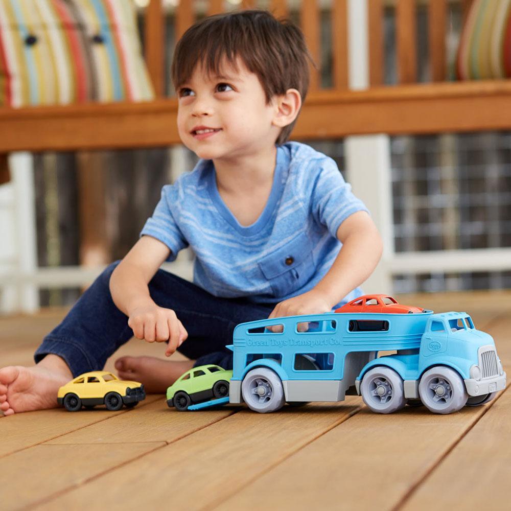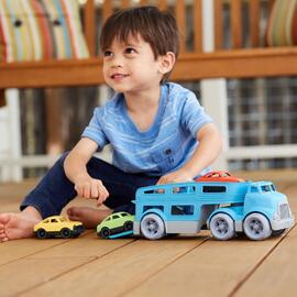 This fabulous Green Toys Car Carrier will inspire little car fans to start their environmentally responsible engines! The Green Toys™ Car Carrier with Coloured Cars is ready to go on the move! This sturdy blue truck hauls 3 mini cars on its back, with working ramps to allow the cars to roll off. The 3 cars are also compatible with the Green Toys Ferry Boat set. This sturdy built to last car carrier play set is just the right size for little hands, stylish, and is made safe for children and the earth they play on.