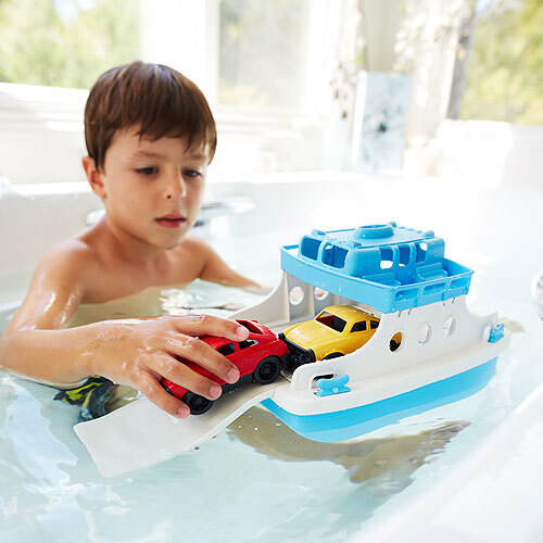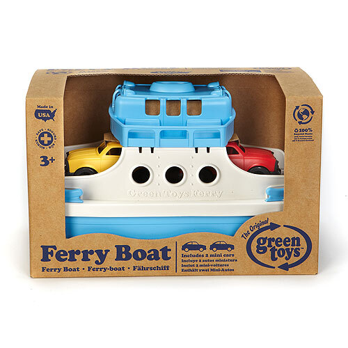 Green Toys - Ferry Boat with 2 Mini Cars is ready to set sail for a quick bathtub excursion or an extended trans-pool voyage! Whatever the adventure, this two-story vessel is ready to hit the open water with room for eco-friendly cargo galore, and even comes with two Green Toys Mini Fastbacks. Use the slide-out ramp to load up the spacious bottom level that accommodates up to four Green Toys cars. The open top deck features two small benches on each side, as well as eleven windows looking down into the main level.