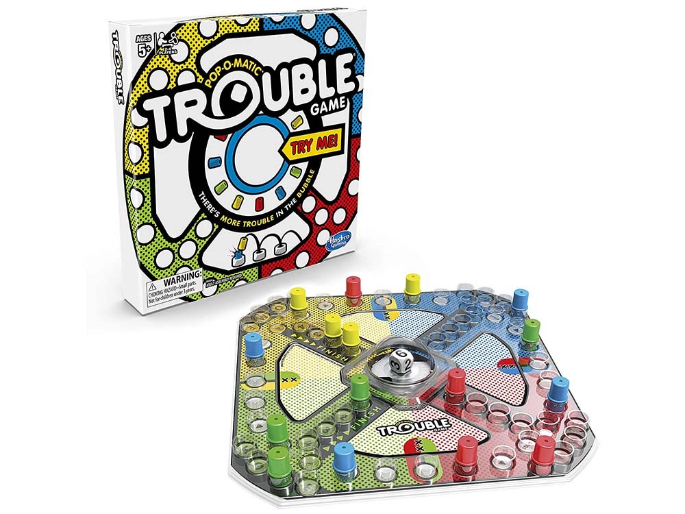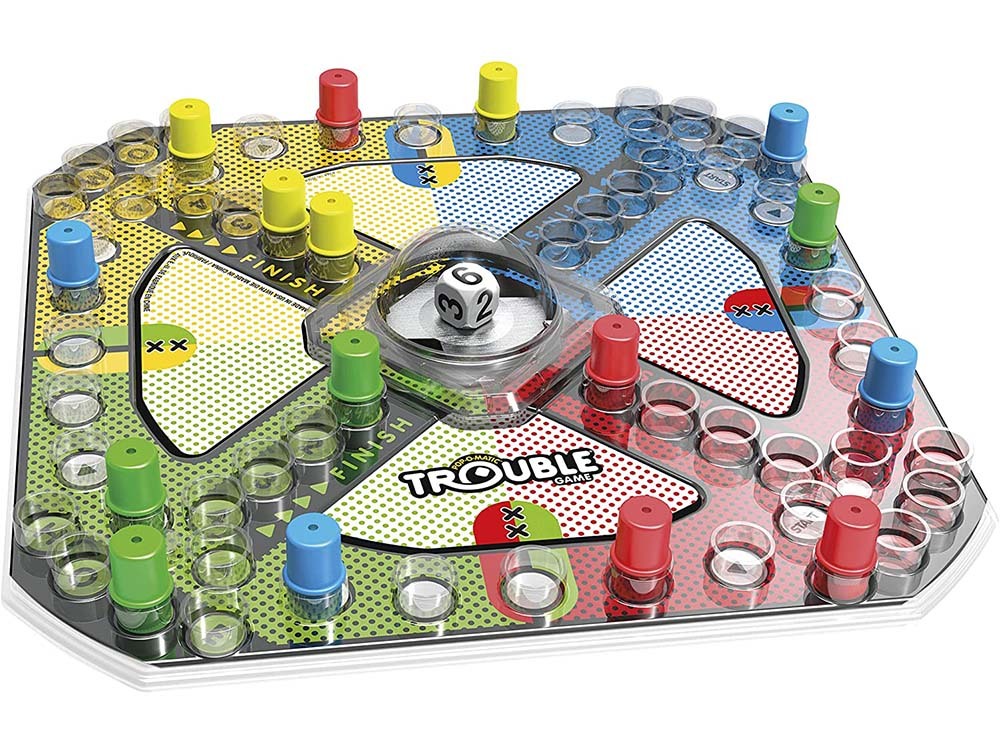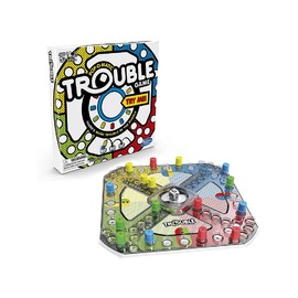Pop into the racing, chasing game where everyone's in Trouble! Set up your pegs and then hit the Pop-O-Matic die roller. Depending on what you roll, you can move your pegs to the Start space, move your pegs forward – or watch other players move while you can't! Each of your pegs has to go all the way around the board to the Finish space, but watch out – if another player's peg lands on the same space as yours, your peg has to start over. The player who gets all 4 pegs into the Finish space wins! Pop all around the board for the win when you play Trouble!