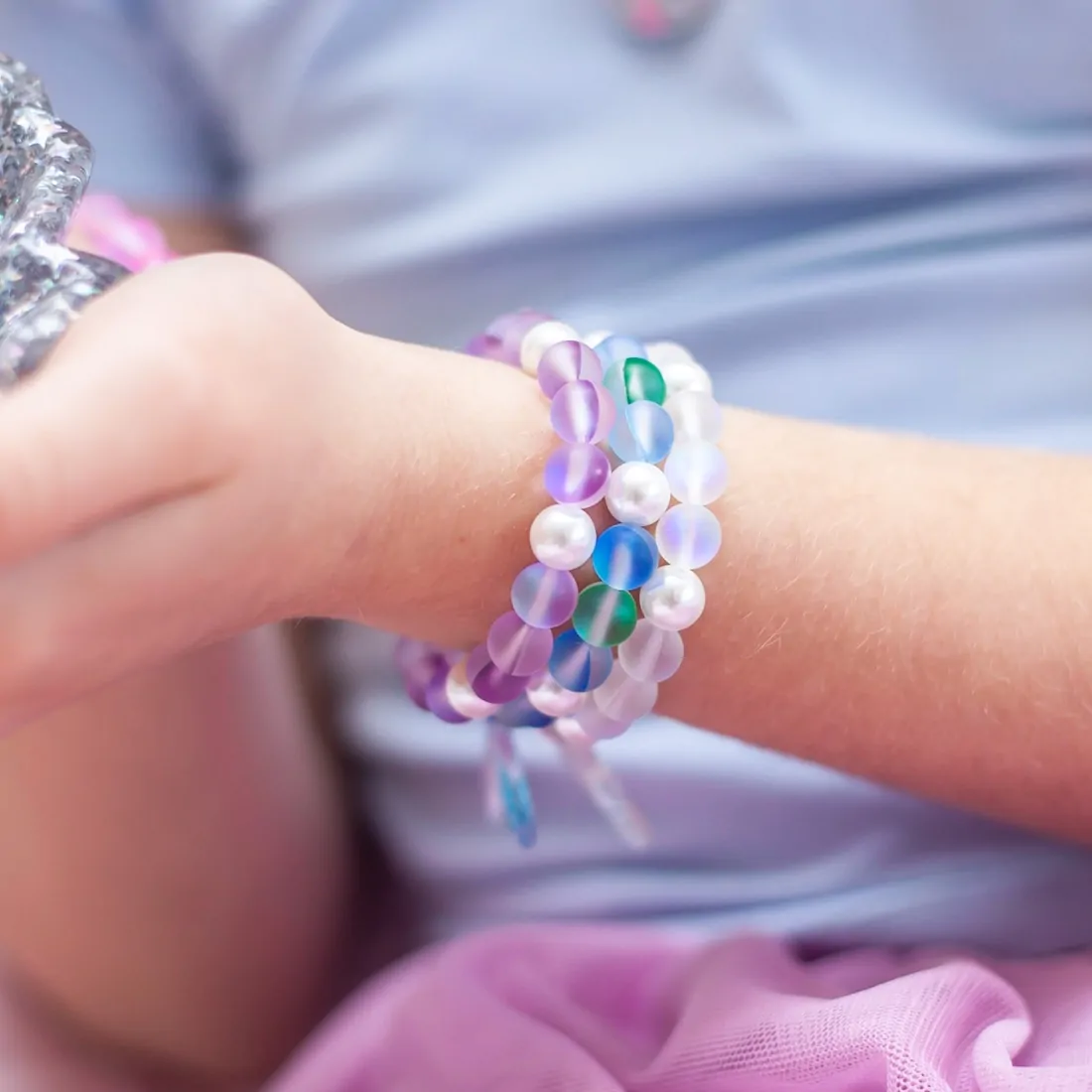 With sea green and blue water Labradorite gems, white pearls like ocean foam, and a beautiful light blue and purple tinged mermaid’s tail charm, the Mermaid’s Tail Elastic Bracelet takes you straight to the water’s edge and invites you to divine in with a splash! This is the perfect bracelet for water babies who love swimming in the pool, going to the beach, or making a mess at bath time!