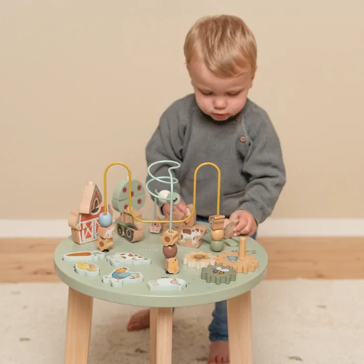 Get up and play! This wooden activity table is packed with fun things to explore. Slide the beads along the spiral, build the farm, solve the puzzle, turn the gears, and move the little sheep, cow, and chicken. With five different activities to discover, it keeps curious toddlers busy while encouraging hands-on play and exploration. Its sturdy, balanced design also supports little ones as they pull themselves up to stand and play and is designed at the right height to support standing and upright play, helping build confidence and strength.