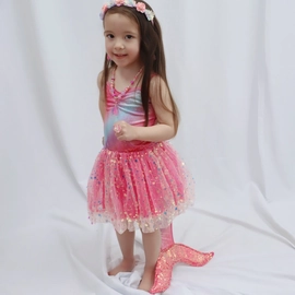 This soft and comfortable mermaid costume is specially made with no itchy seams or underskirts for maximum comfort. With a colour palette of gorgeous ocean light blues, aquas, pinks and purples; with a laser-cut taffeta mermaid tail for added realism. Topped with no-shed glitter that ensures all that shimmery magic stays on your little mermaid.