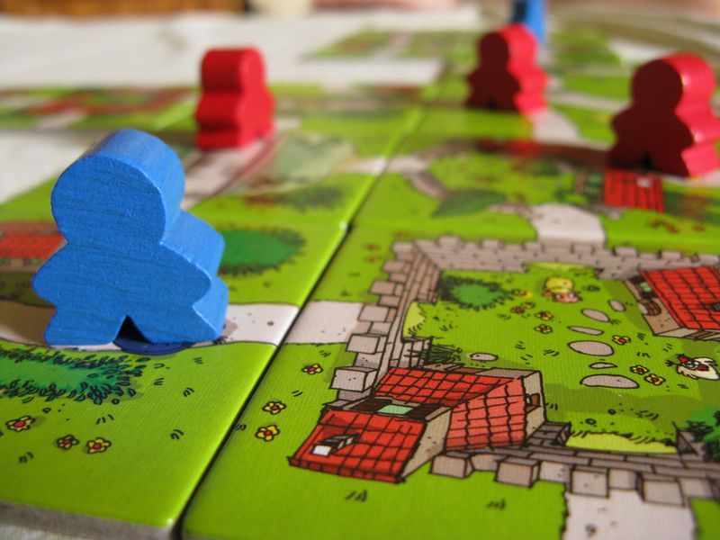 The players in turn draw a landscape tile and place it; unlike in normal Carcassonne, they always match. Amongst other features, the tiles show children in the player colors on the roads. Whenever a road is finished, every player places one of his meeples on each appropriate picture.