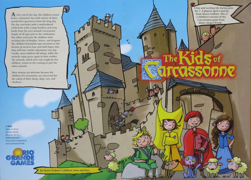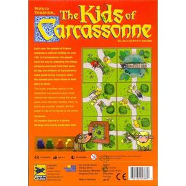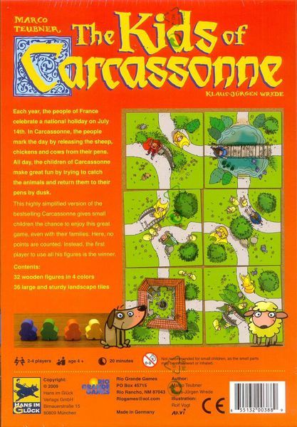 My First Carcassonne | Board Game hails from a story in France on July 14th - a national holiday in France, where sheep, chickens and cows are set free in the town of Carcassonne. The children have great fun to catch the animals before dusk.