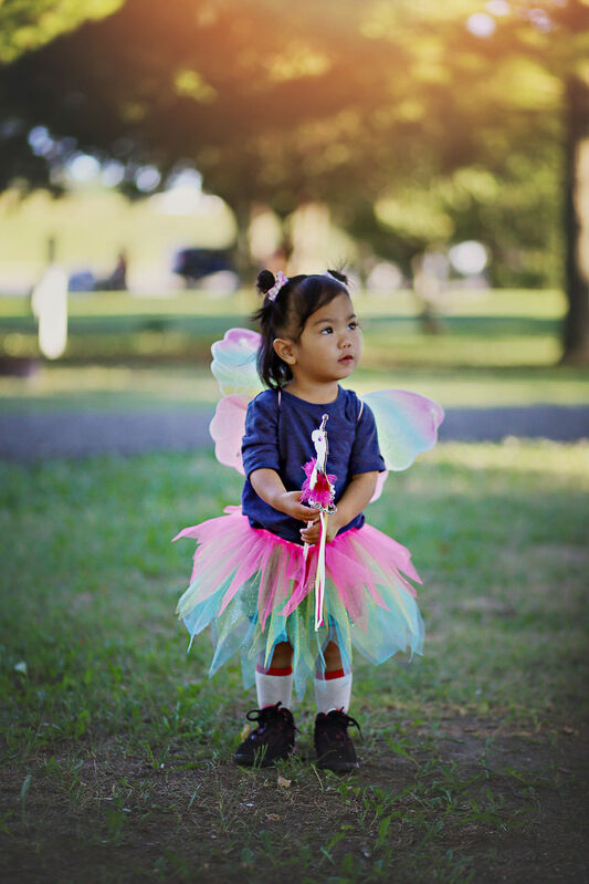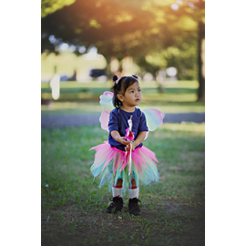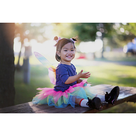This skirt set is made of delicate glitter tricot tulle that is cut to be petal flawless. The matching rainbow wings have a stunning glitter print that is sure to shimmer, and the rainbow wand is finished with soft tulle and multicoloured ribbons. This three-piece ensemble is the ideal complement to playtime fashion!