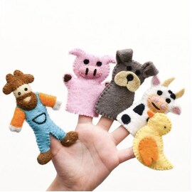 Our Farm Animals set consists of Old MacDonald (farmer), cow, dog, pig and duck. The finger puppets are made of 100% organic sheep wool, hence its safe for use with children.