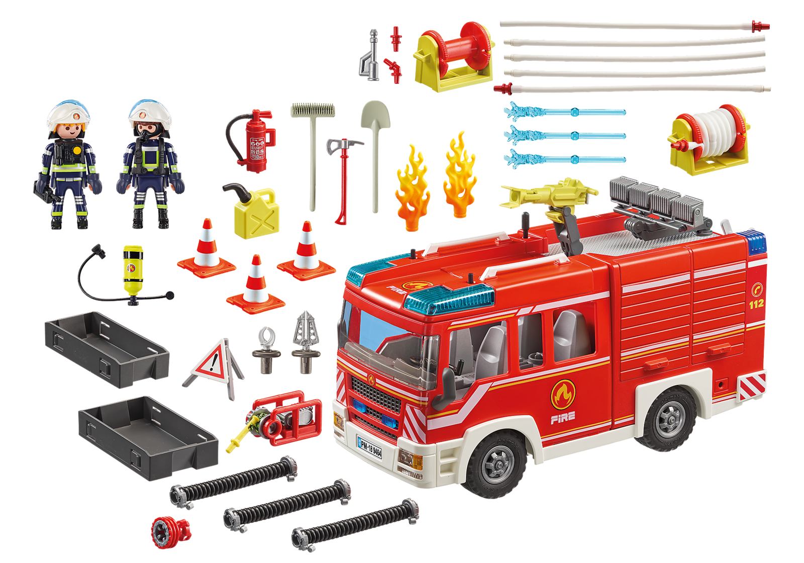 Set includes A Playmobil Fire Engine, 2 Playmobil firemen and lots of fire fighting accessories.