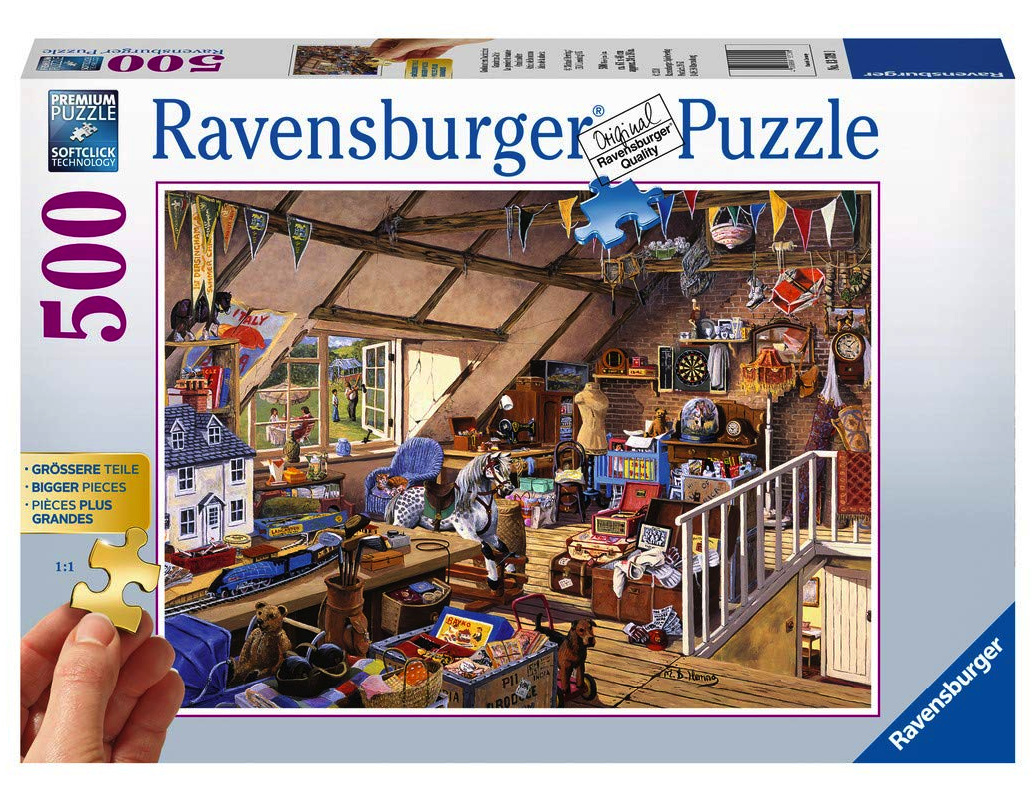 Puzzle fans and families will adore creating this colourful Ravensburger Grandma's Attic 500 larger piece jigsaw puzzle. 500 piece puzzles are the perfect introduction to the relaxing world of puzzling for families, older children and adults. Our vast collection includes travel destinations, landmarks, ocean waterscapes, famous cities or a favourite nostalgia or fantasy world puzzle. Finished puzzles can be used to decorate your favourite room using puzzle conserver.