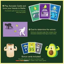 Throw Throw Avocado is unlike any game you’ve played before. In this dodgeball card game, go head to head with your opponents collecting cards while throwing and avoiding squishy, adorable Avocados. Play Throw Throw Avocado as a standalone sequel, or use the BONUS deck of cards included and combine them with the cards from Throw Throw Burrito to unlock a new combo game using all four throwables!