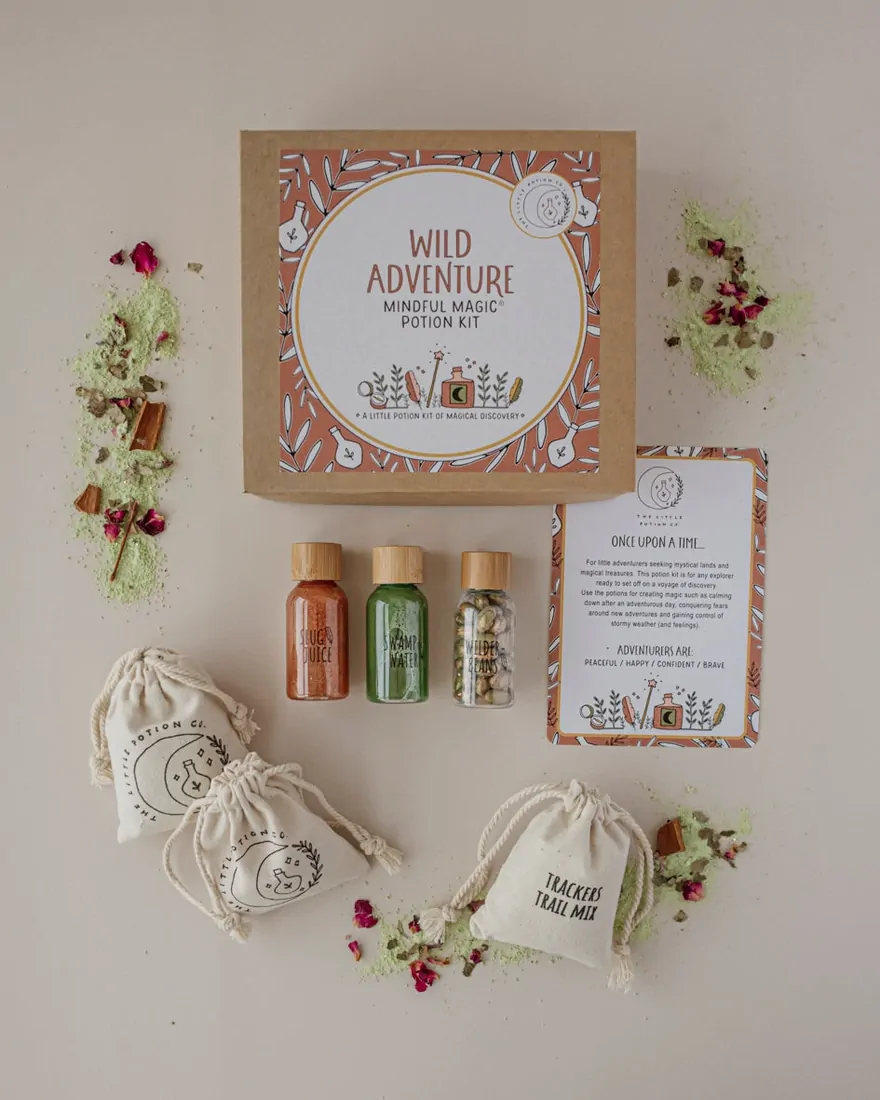 MAGICAL ADVENTURE Potion Recipe Cards include the following spells: * Tame The Wild Beast - a potion for calming down after an adventurous day. * Travelers Tonic - a potion for travelling and starting new adventures. * Sunshine On Rainy Day - a potion for helping stormy thoughts * Imagination Navigation - a potion to create a navigational tool for finding magical realms * Affirmations - Peaceful, Happy, Confident, Brave PLEASE NOTE: This kit no longer contains borlotti beans. This has been changed to a new ingredient, brave root. Please see ingredients tab for up to date ingredients listing.